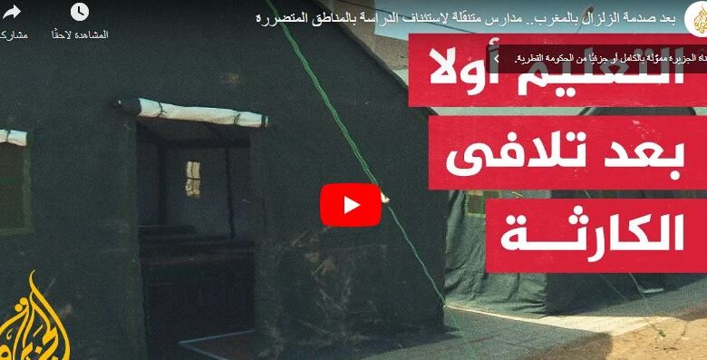 الرئيسية/فيديوهات/بعد صدمة الزلزال بالمغرب.. مدارس متنقلة لاستئناف الدراسة بالمناطق المتضررة فيديوهاتبعد صدمة الزلزال بالمغرب.. مدارس متنقلة لاستئناف الدراسة بالمناطق المتضررةوكالة الفتح الإخبارية أرسل بريدا إلكترونيا سبتمبر 17, 2023 وكالة الفتح الإخبارية أرسل بريدا إلكترونيا سبتمبر 17, 2023 شاركها فيسبوك تويتر بينتيريست ماسنجر ماسنجر واتساب تيلقرام
