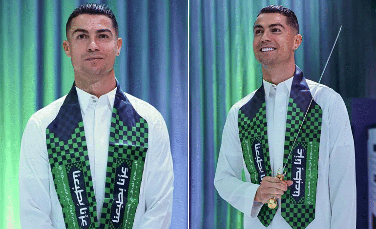 ونشر رونالدو عبر حساباته الرسمية على منصات التواصل الاجتماعي صورا ومقاطع فيديو ظهر فيها مرتديا الجلباب السعودي ووشاحا يحمل عبارة “عزنا بطبعنا”، بينما أمسك بسيف تراثي، وعلق قائلا: