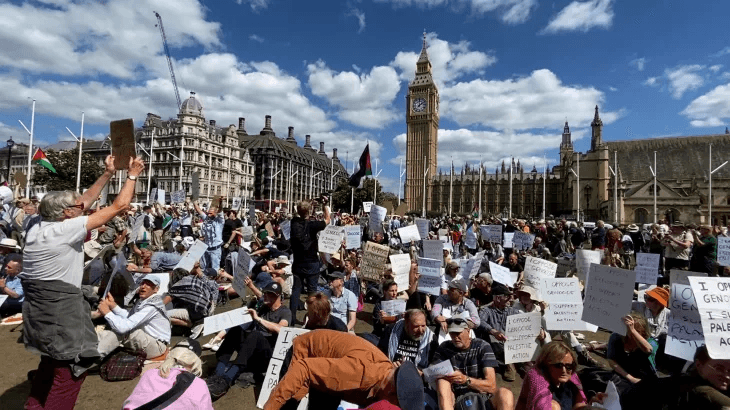 وفي لندن، اعتقلت الشرطة البريطانية 365 شخصاً خلال مظاهرة مؤيدة لحركة فلسطين أكشن المحظورة منذ يوليو/تموز الماضي بموجب قوانين مكافحة الإرهاب، وهو أكبر عدد من الاعتقالات في احتجاج واحد بالعاصمة. ورفع المتظاهرون لافتات كتب عليها: “أنا ضد الإبادة الجماعية، وأدعم فلسطين أكشن”.